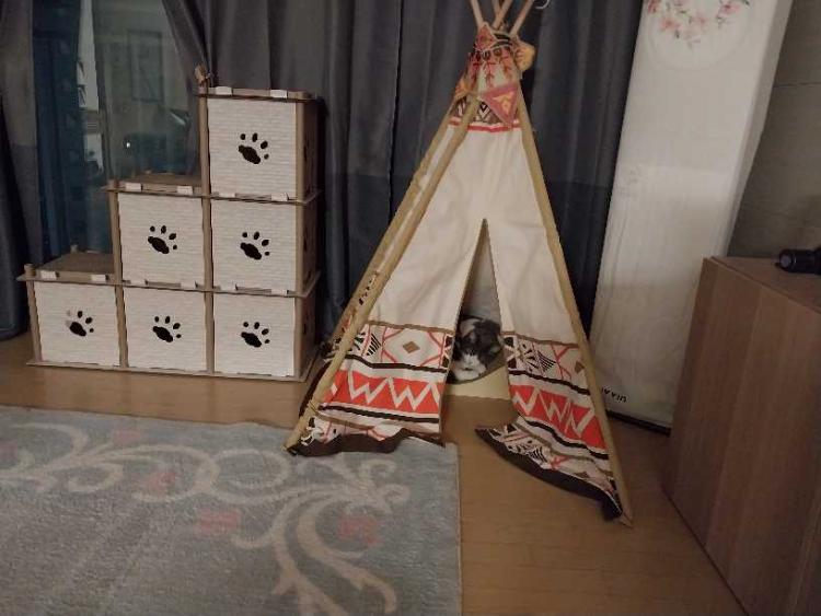 고양이가 인디언텐트 안에서 나올 생각이 없어 보이네요. 넘 아늑하고 편안할 것 같아요 😼❤