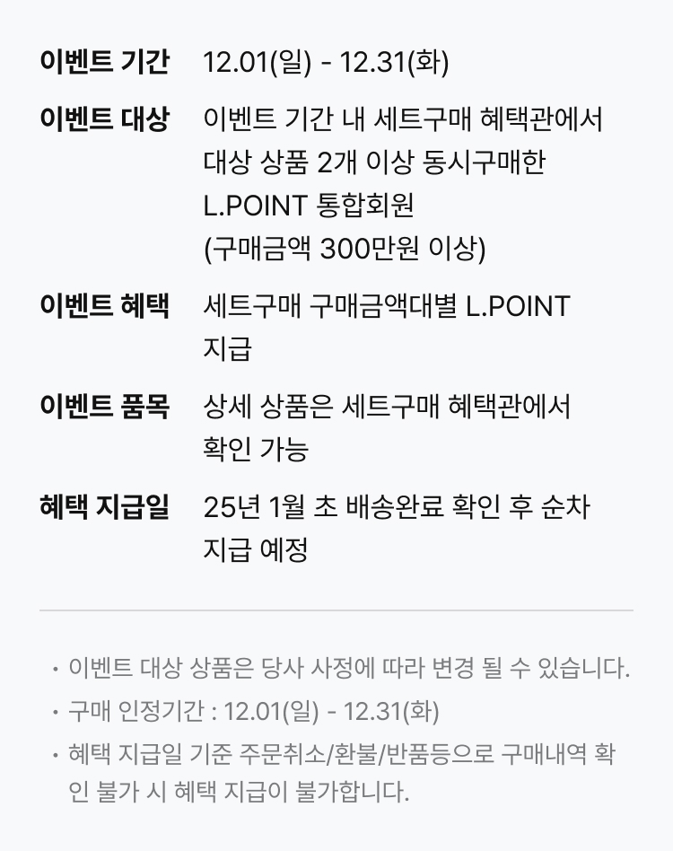 · 이벤트 기간 내 세트구매 혜택관에서 대상 상품 2개 이상, 구매금액 300만원 이상 결제한 고객에 한해 혜택이 지급됩니다.
