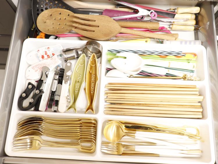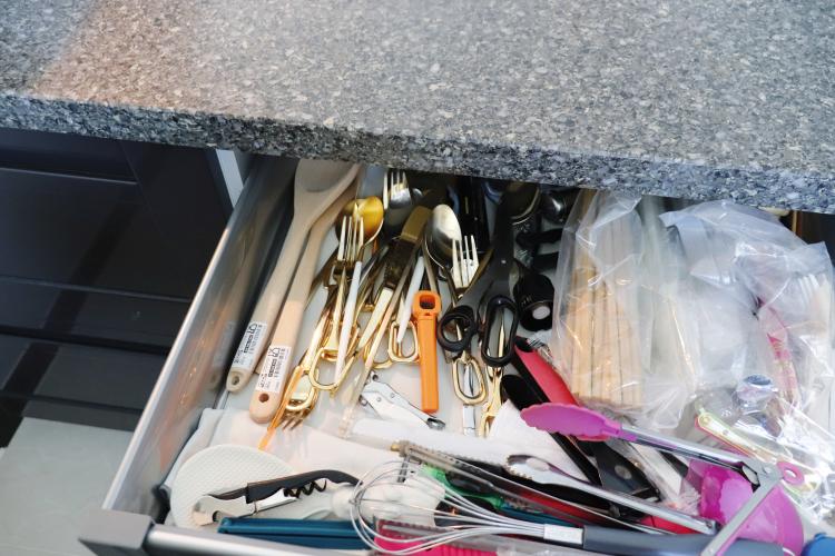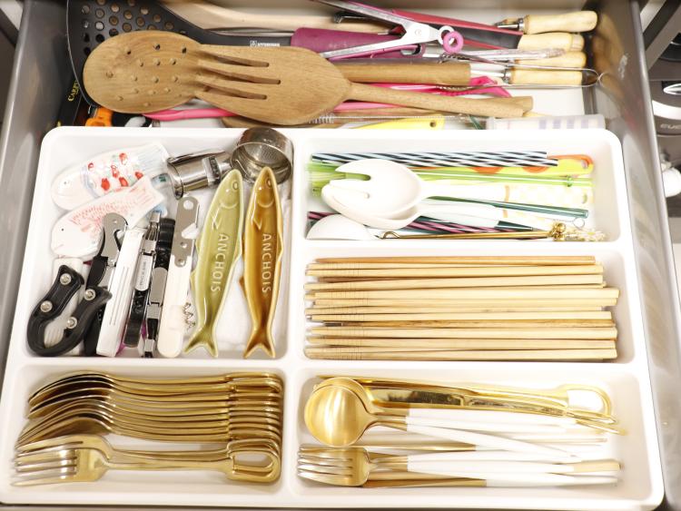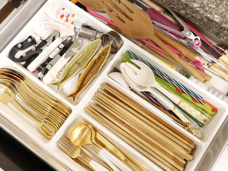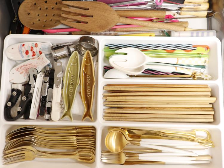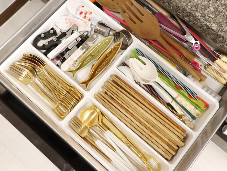 정리가 가장 어려운 곳이었던 수 많은 커트러리류와 조리도구들은 처음엔 이렇게 방치 하듯 두었는데 지금은 이렇게 정리도구함을 이용해 종류별로 깔끔하게 보관하고 있답니다.