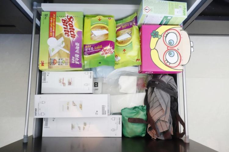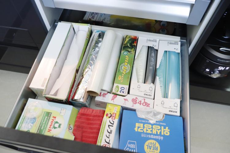 주방에 필요한 랩, 종이호일, 위생장갑, 지퍼백은 기존 박스를 그대로 활용하여 사이즈에 맞게 넣어서 보관을 하고 있어요. 기존 박스를 잘 활용하면 깔끔하게 정리 되어 사용할때 마다 찾아 헤매는 어려움을 없애 준답니다.