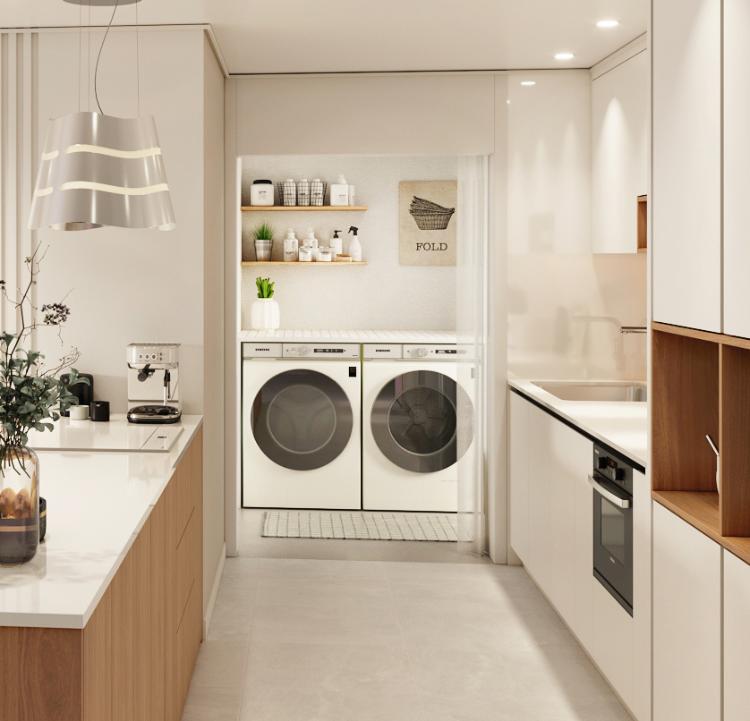 깔끔함이 돋보이는 대면형 주방과 세탁실 인테리어