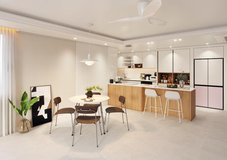 또 냉장고도 키친핏 제품으로 선택했는데요. 냉장고 장과 맞춰 어울려 들어가니 깔끔하고, 올 화이트보단 하단에 핑크를 넣어 포인트를 줬는데 훨씬 예쁜 것 같아요