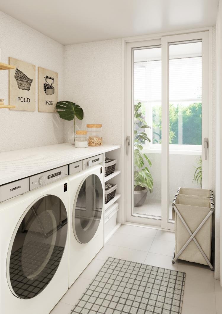 세탁기와 건조기는 병렬로 배치했는데요. 공간적 여유가 된다면 병렬로 설치해보시는 건 어떨까요? 빨랫감을 옮겨 넣기도 편하고, 공간을 효율적으로 활용할 수 있답니다.