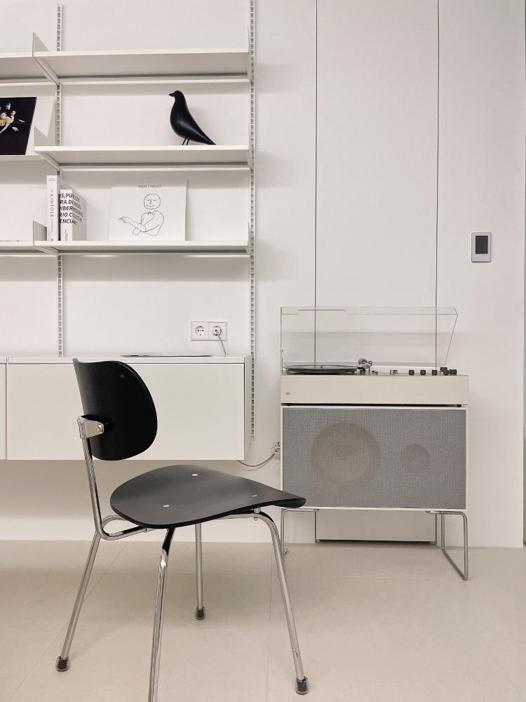벽에는 레어로우 제품으로 좋아하는 소품을 올려두곤해요. 턴테이블과 nemo as41c조명, 다양한 의자들이 함께해서 쇼룸 같은 공간으로 완성됐어요.