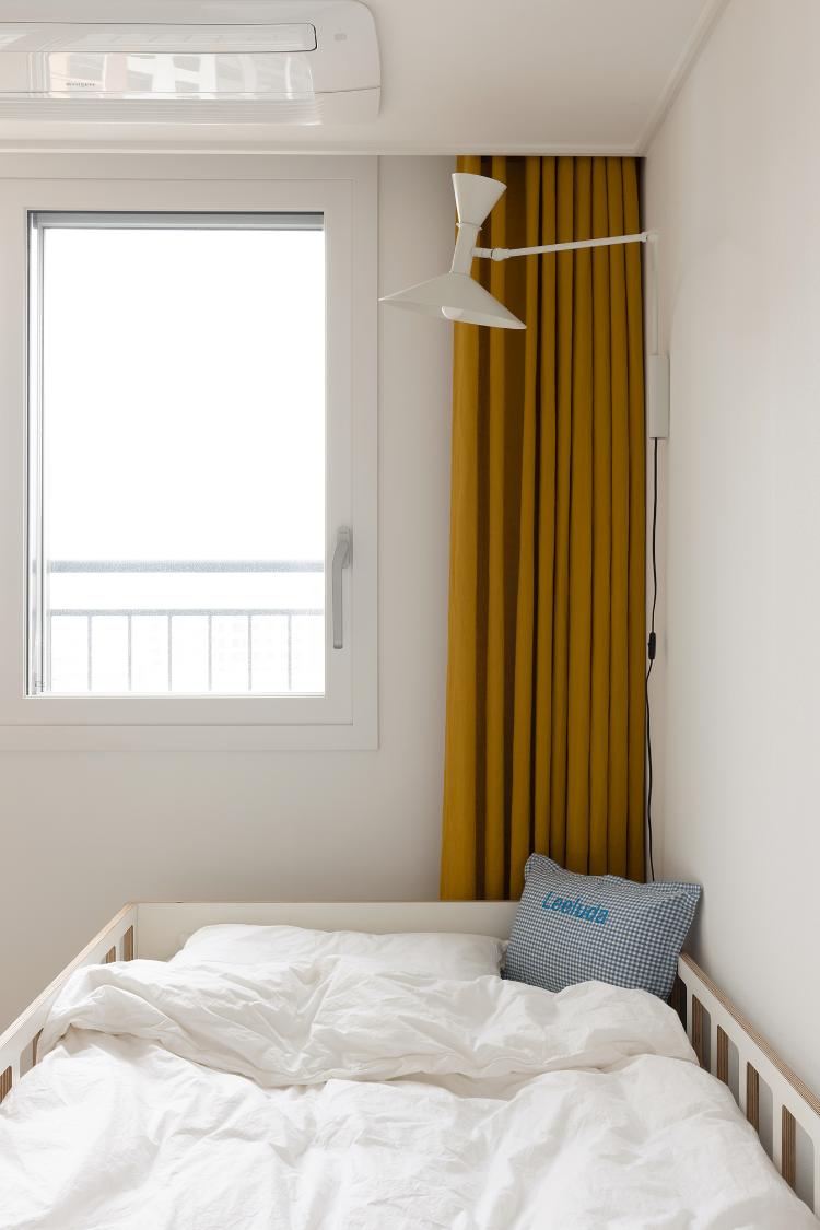 차가운 우리집에 유일하게 따듯한 공간이랄까요? 머스타드 커튼과 우드로 포인트를 줬어요.