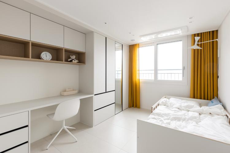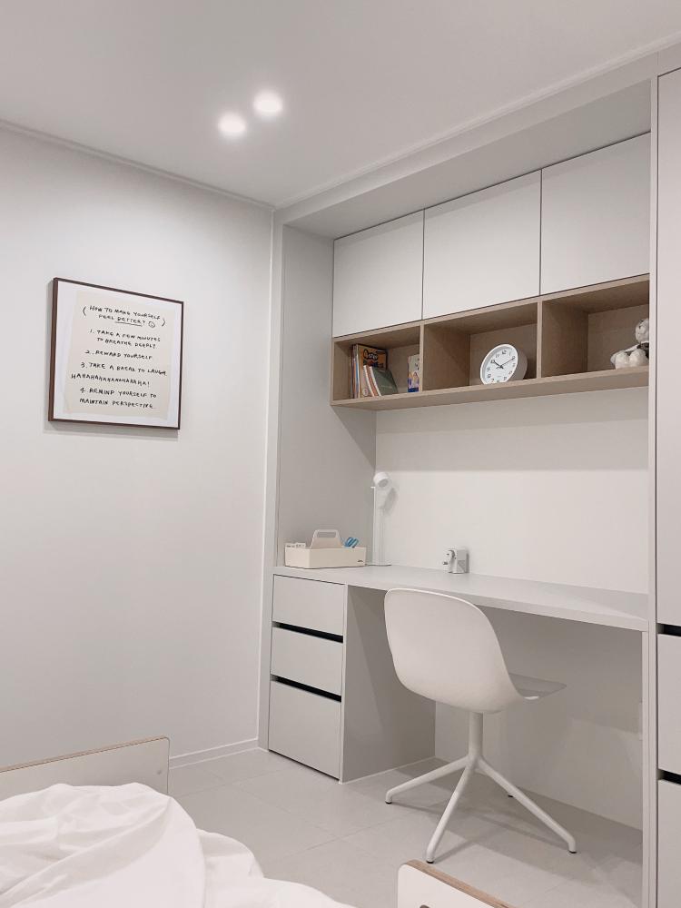 이방 역시 기본 옵션 학령기장에 우드 시트지만 시공했는데 너무나도 만족하고 있어요. 책상과 옷장이 함께 있으니 이동이 편리하고 침대도 자작나무 소재로 구매했더니 잘 어울려요.