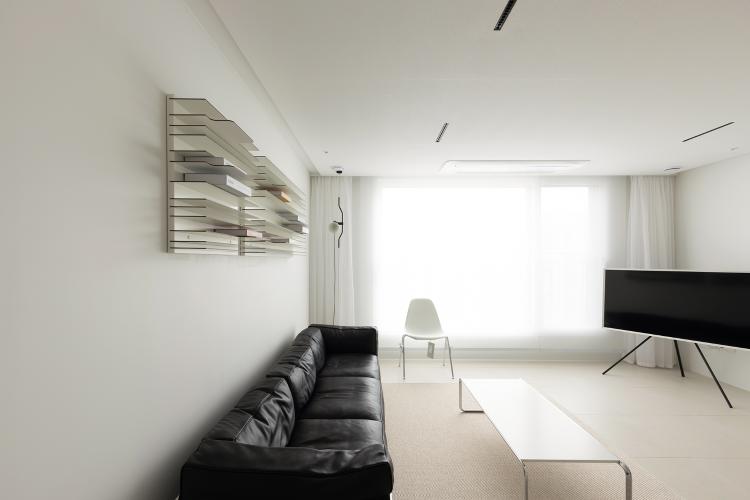 화이트한 공간에 포인트를 주고자 블랙 소파로 공간을 완성했어요. 포인트가 되는 소파 옆 플로스 조명도 한몫 했구요!