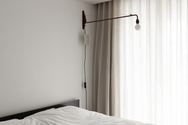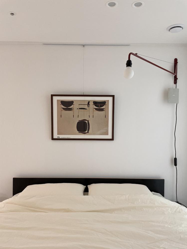 침대 위 비트라쁘띠포텐스 조명은 레드 컬러인데 침대와 너무 잘 어울려요. 미드센츄리모던 스타일을 좋아해서 구매하였는데 아주 만족하고 있어요.