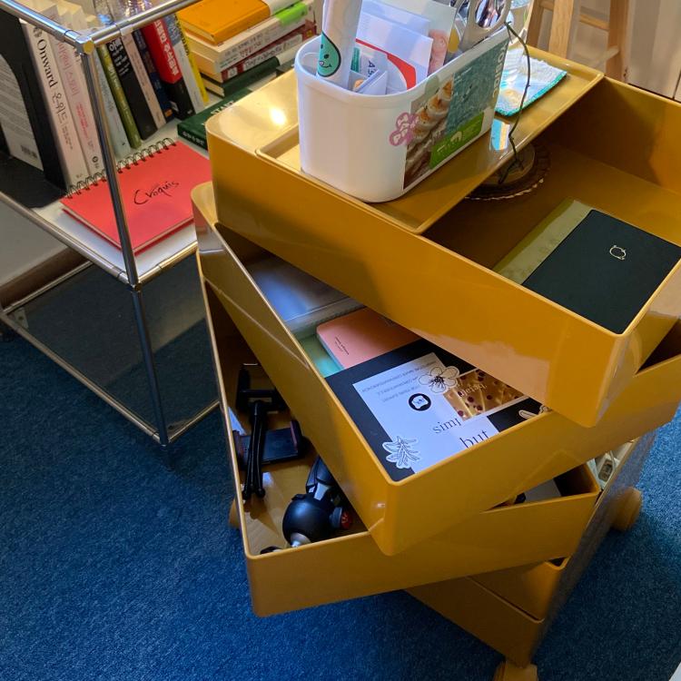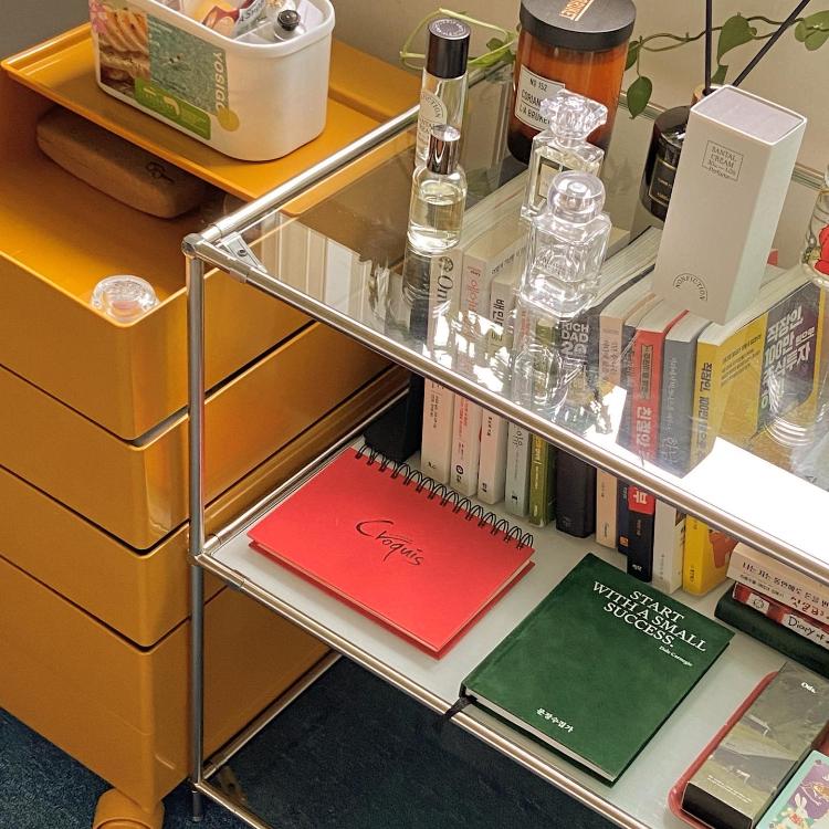 책상 오른쪽으로는 노란색 트롤리와 모듈 선반을 배치해 봤어요. 노란 트롤리는 러그 색감과 잘 어울릴 거 같아 구입하였는데 찰떡같이 어울려서 만족하고 있습니다.