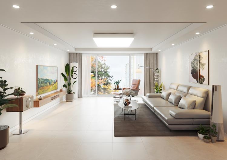 따뜻한 온기가 느껴지는 아이보리 계열의 톤을 사용하여 집안을 꾸며, 집이 너무 답답해보이지 않게 하였고 식물의 그린색을 섞어 푸르른 느낌을 넣어 인테리어 해보았어요. TV는 액자처럼 인테리어가 되서 TV를 켜지않아도 집안에 활기를 넣어줄 수 있는 가전템을 배치했어요. 아래 TV장을 활용하여 수납공간과 거실의 포인트를 더해 줬습니다. 모던한 느낌의 화이트&그레이를 활용하여 고급스러운 느낌을 주도록 했습니다.