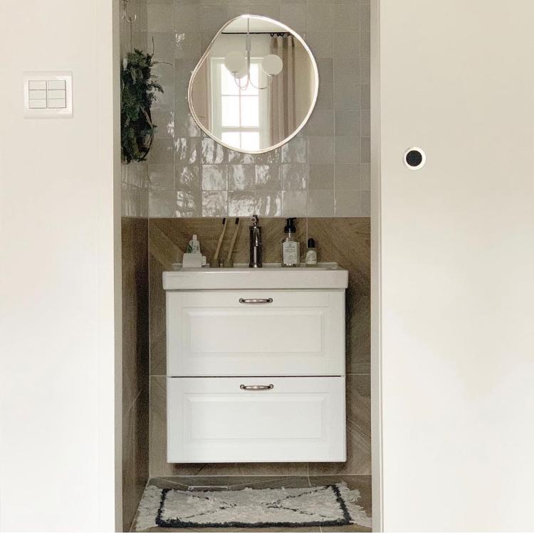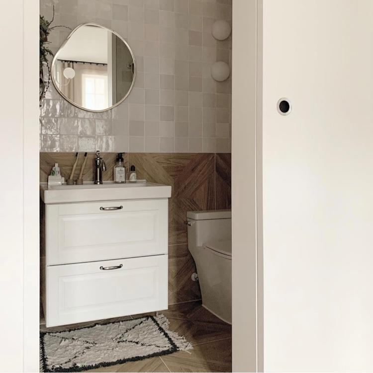 주방에 사용했던 바닥타일과 벽타일을 그대로 욕실에 옮겼더니 또 다른 느낌이죠? 세면대 하부장에는 욕실용품과 화장품을 수납해 사용하고 있어요.