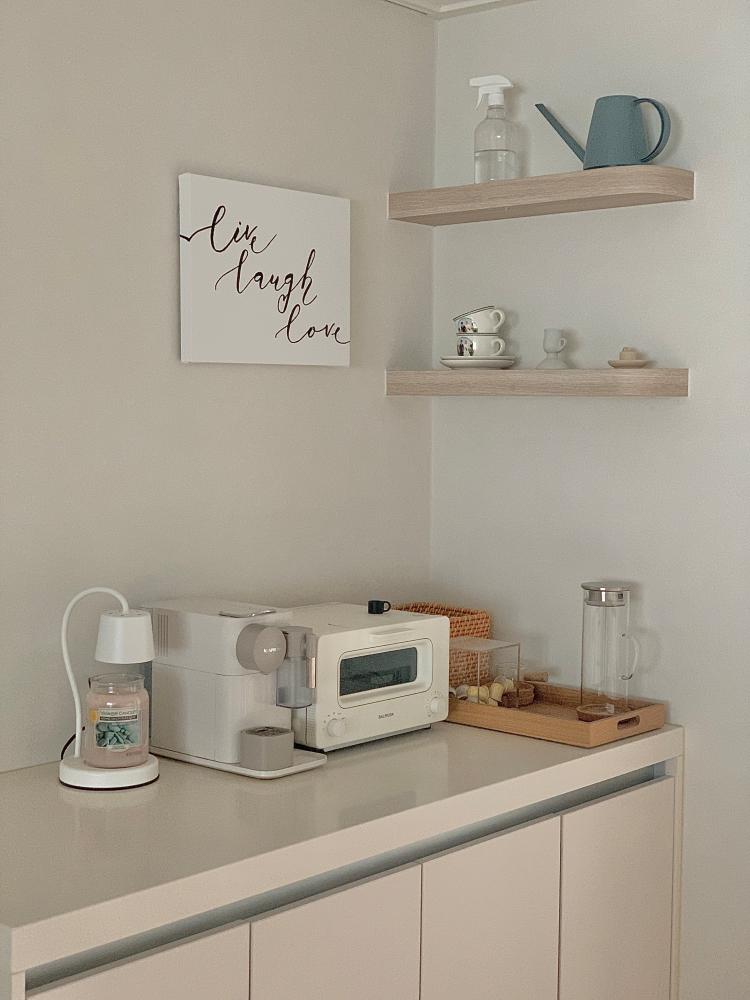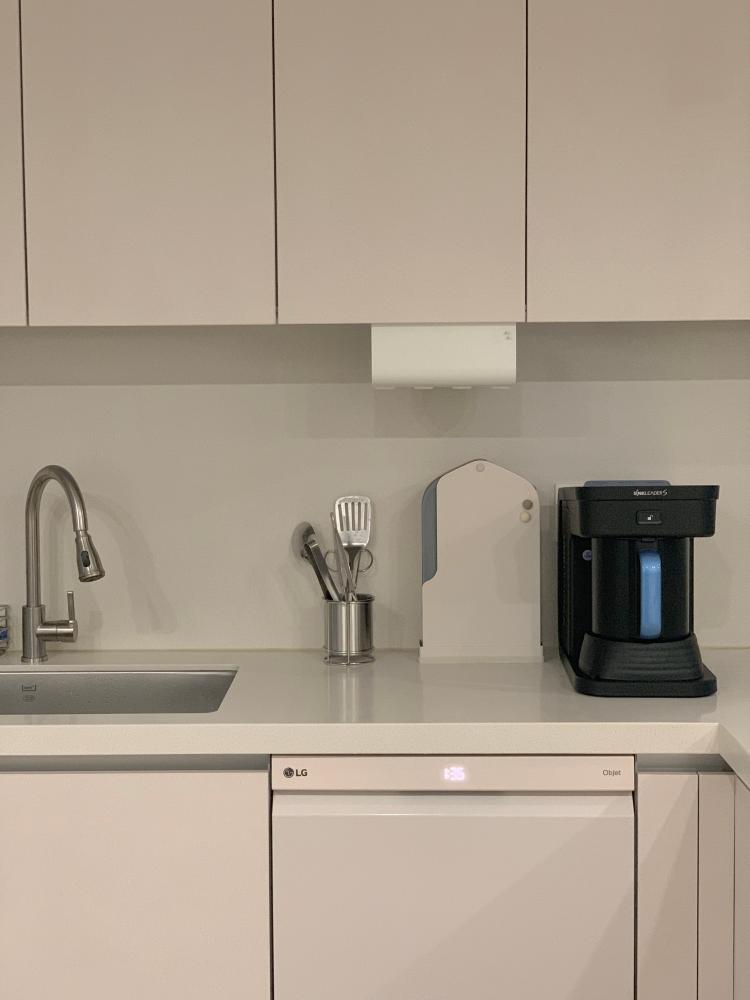 메인 싱크대 맞은 편에는 별도의 하부장을 맞춰 주방 가전을 올려 두고 사용하고 있어요. 본래 이 자리는 냉장고를 두기 위한 공간으로 의도되었던 것 같아요. 다만 저희 집 냉장고는 키친 핏이 아니기에 주방 베란다로 보내줬습니다.