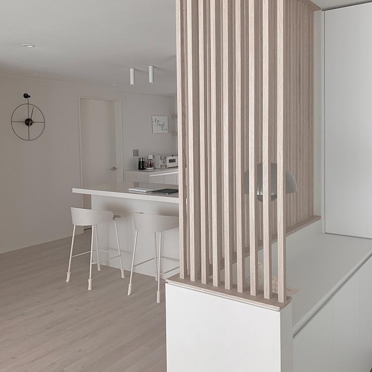현관은 가장 고민이 많은 공간이었어요. 구축 아파트의 2BAY 구조 상 현관문을 열면 바로 거실이 시작되는 형태인데요, 현관과 거실의 공간을 우드 간살을 제작하여 분리했고 현관의 입구 방향을 정면에서 측면으로 바꿨습니다.