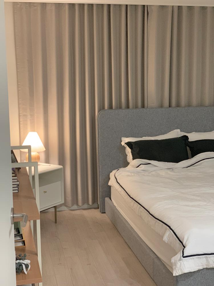 안방은 평범한 편이에요. 베란다 확장은 불가능해서 암막 커튼으로 베란다 창문을 가려주었고, 부족한 수납공간을 채우기 위해 붙박이 장을 설치했습니다.