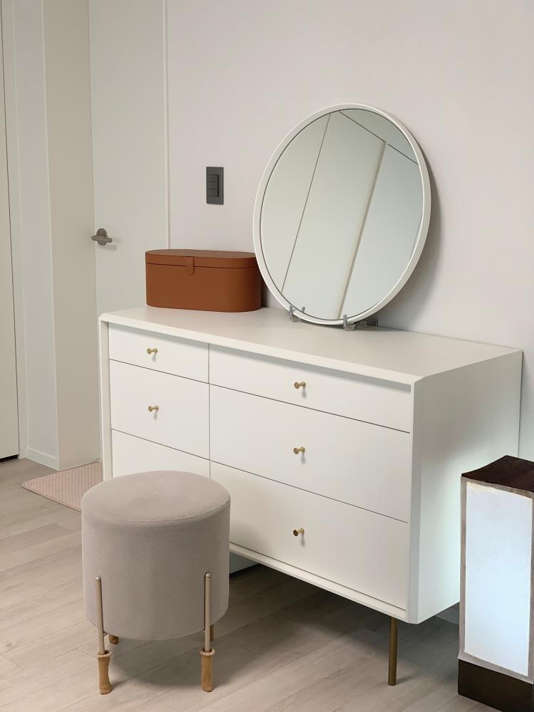 안방에는 작은 욕실이 하나 있는데 동선 상 화장대가 한 공간에 있는 게 편리할 것 같아서 드레스 룸에 두지 않고 안방에 뒀어요. 서랍형 화장대로 수납도 넉넉한 편이에요.