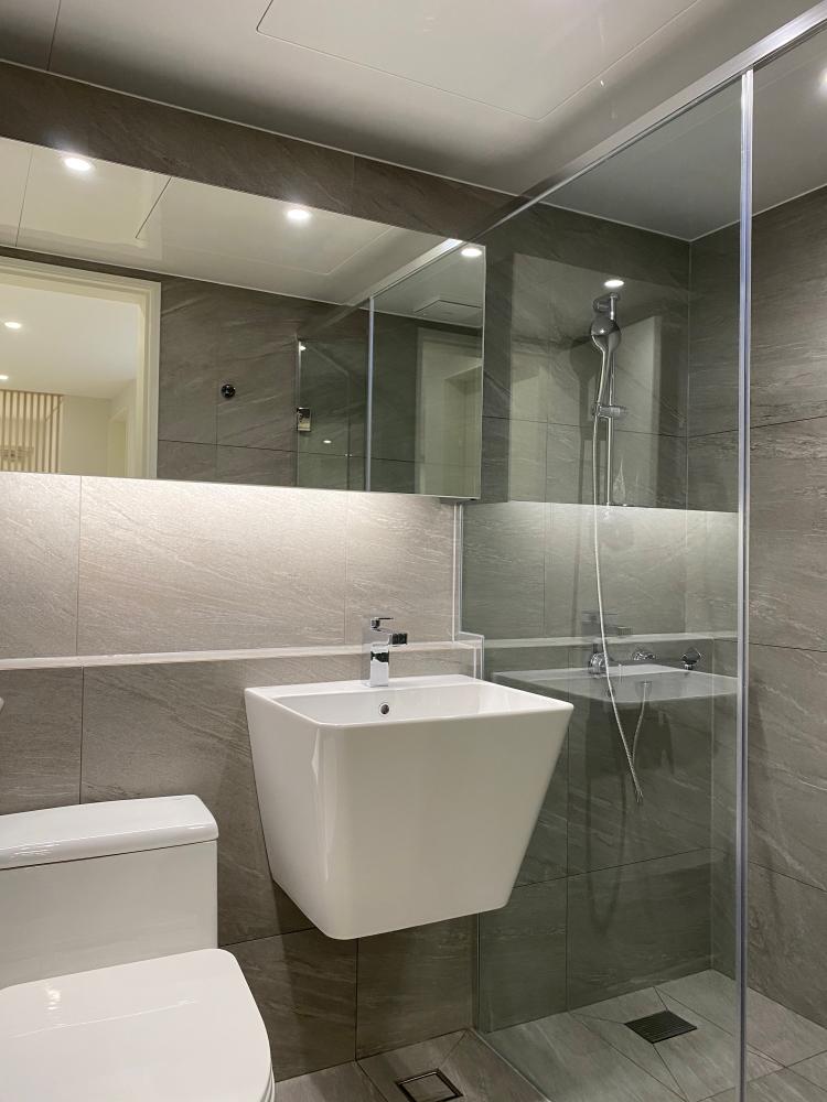 그리고 젠다이(조적벽)을 변기와 세면대, 샤워부스 안쪽까지 시공하여 통일감을 주었습니다. 거실 욕실은 물결 무늬의 그레이 톤 타일을 선택했는데 한층 고급스러운 느낌을 주는 것 같아요.