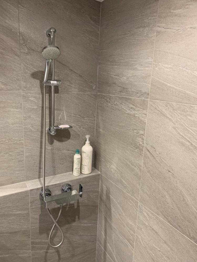 욕실 리모델링에서 가장 신경 쓴 부분은 포세린 타일과 젠다이(조적벽) 입니다. 저희 집에는 거실과 안방에 각각 욕실이 있는데, 양쪽 모두 600 * 600 사이즈의 포세린 타일을 시공했어요.