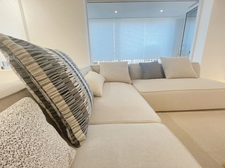 거실에서 먼저 소개할 부분은 이사하기 전부터 꼭 놓고 싶었던 패브릭 소파에요. 아이들이 있다 보니 세탁이 가능한 제품이 필요해서 아쿠아 패브릭 제품을 골랐는데요. 6개월째 사용 중이지만 물티슈로도 깨끗하게 잘 유지되고 있어서 세탁할 일은 많이 없을 듯해요. 눅눅하고 찝찝한 느낌의 소재가 아니라 쓰면서 더욱 만족하는 제품인데요.