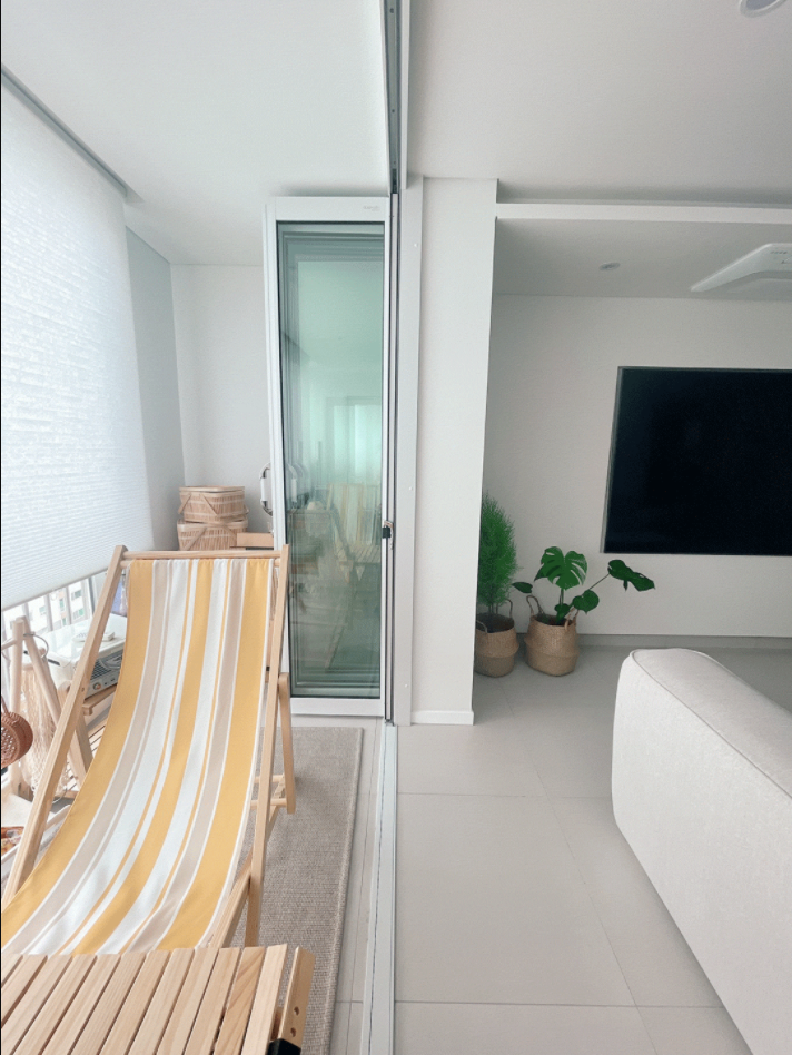 홈캠핑장을 만들기 전 가장 먼저 고민한 부분이 있었는데요. 거실과 베란다의 경계인 이 부분에 확장을 할 것인가, 폴딩도어를 둘 것인가였어요. 그런데 아예 확장을 하기엔 30년이 다 되어가는 구축이기에 한겨울 추위나 한여름 더위가 걱정되더라고요.