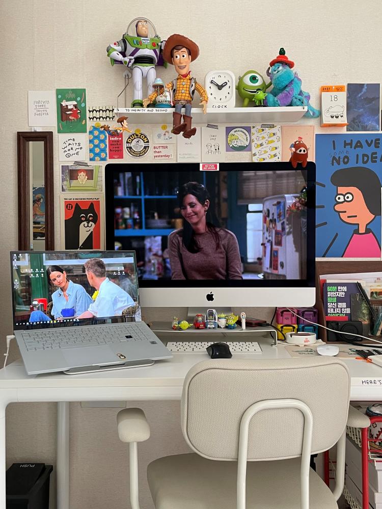 코로나로 인해 재택근무가 길어지면서, 침실 공간 중 작업 공간은 정말 많은 변화가 있었어요. 우선 작은 크기의 책상을 좀 더 큰 크기로 바꿨고, 오래 앉아 있어도 불편하지 않은 의자로 교체했죠.