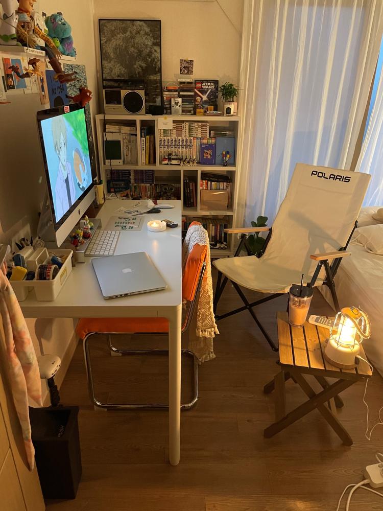 그렇게 확보한 공간에서 이렇게 캠핑 의자를 놓고 넷플릭스를 보거나, 나만의 작은 홈캠핑을 즐기기도 해요. 캠핑 의자는 정말 잘 샀다!고 생각하는 제품 중 하나에요. 우선 접고 펴기가 수월해서 좁은 공감에서 사용하기에 부담이 없고, 각도 조절도 가능해서 의자에 거의 눕다시피해서 독서를 하거나 영화를 보기도 좋고, 여차하면 들고 나가서 공원에서 사용할 수도 있거든요.