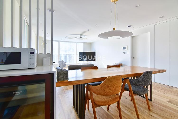 다음으로 보실 곳은 주방입니다. 섬세한 쉐입에 은은한 조도를 가진 팬던트가 설치되었어요. 오른쪽에는 부분적으로 간살 파티션을 적용해 공간의 구분성을 주면서 포인트도 되도록 했어요ㅎ