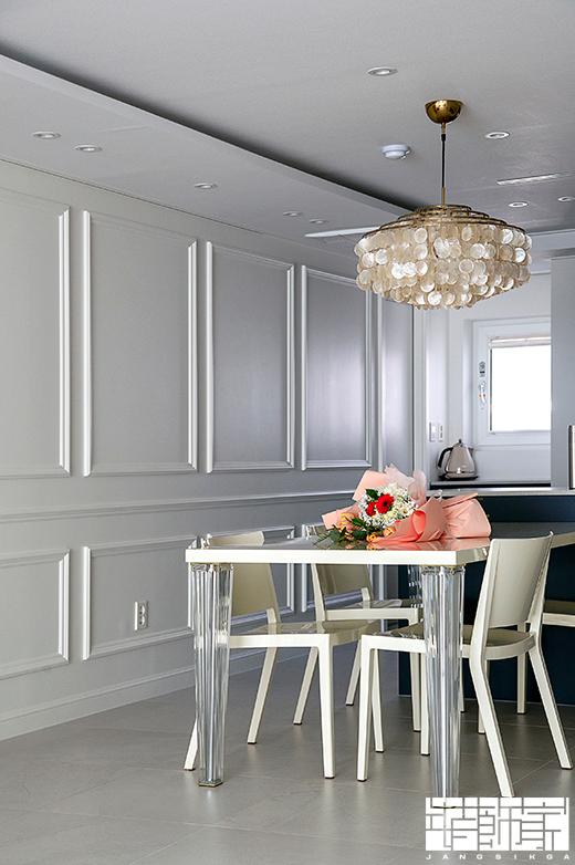 거실과 이어진 다이닝룸은 거실과 통일감이 들도록 벽면에 웨인스코팅 시공을 했습니다. 다이닝룸 가운데에는 작은 원형 자개를 엮어 만든 화려한 모빌 같은 펜던트 조명으로 포인트를 더했어요. 조명 덕에 모던 프렌치한 감성이 더욱 살아나는 것 같죠?