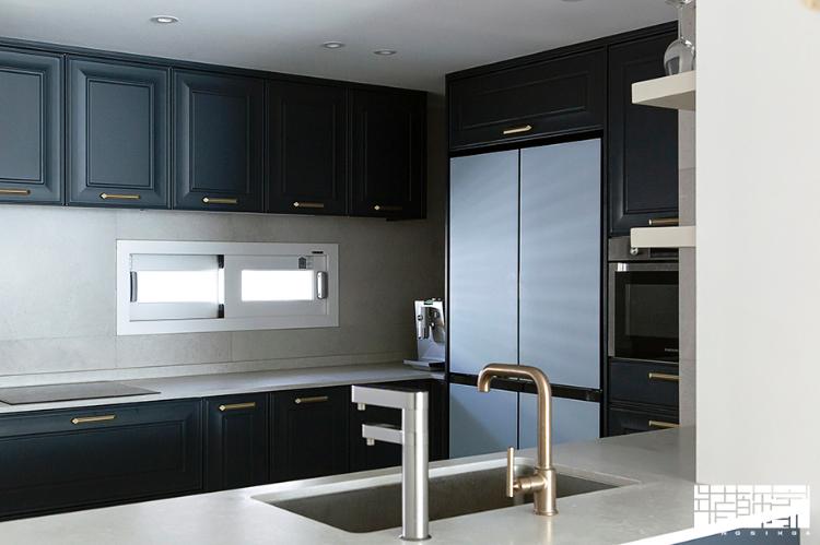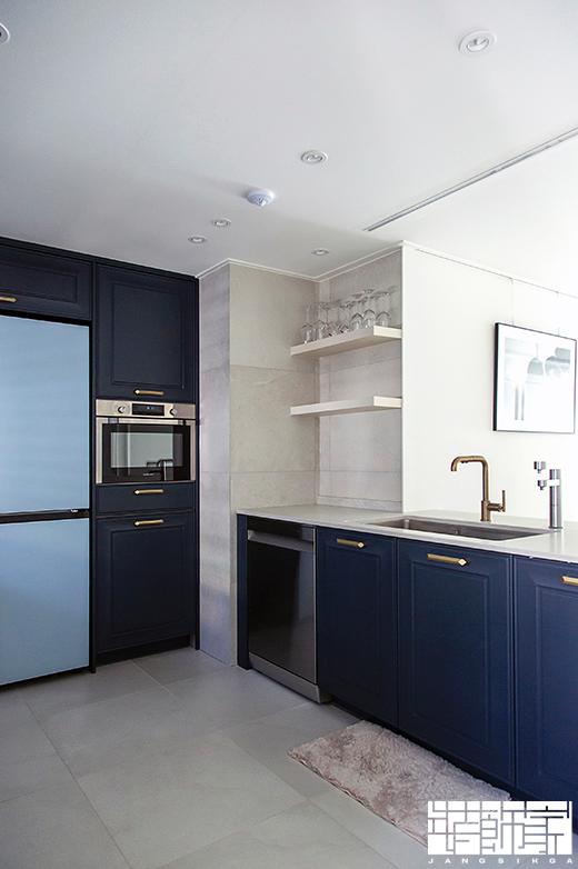 주방가구는 톤 다운된 딥블루 네이비 컬러를 선택해서 프렌치 시크 감성을 살렸어요.
