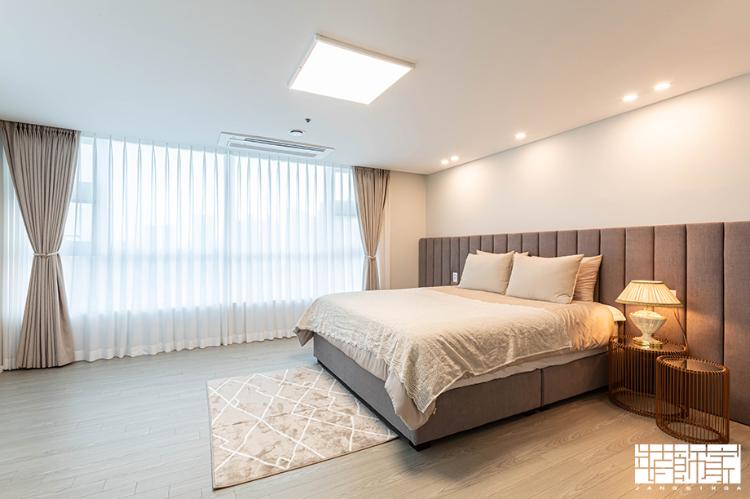 모던한 느낌의 거실과 달리 침실은 내추럴하면서도 포근한 분위기를 연출하였습니다. 부드러운 그레이와 베이지 컬러를 적절히 믹스 매치하여 편안한 분위기의 뉴트럴컬러인테리어를 완성하였습니다.