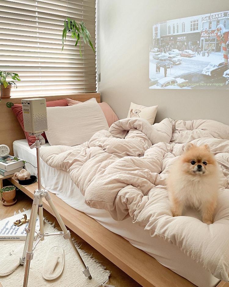 귀여운 멍뭉이와 함께하는 yuna****님의 침실입니다! 허전한 벽 쪽엔 빔프로젝트로 꾸며주셨네요:) 폭신폭신한 이불과 함께 너무 잘어울려요^-^