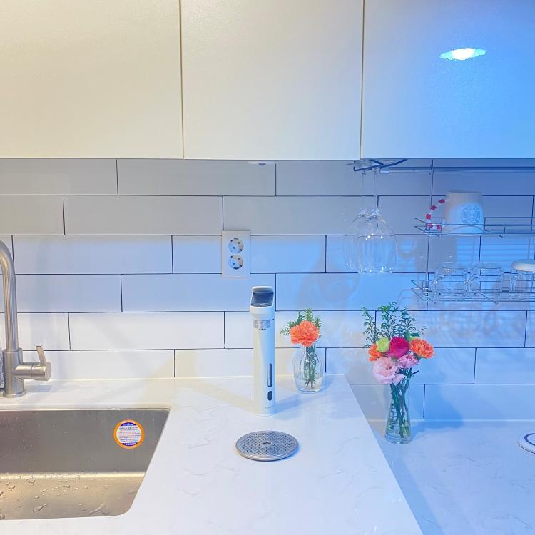 깔끔하게 화이트로 맞추신 humo****님의 주방입니다. 가운데에 비스포크 정수기와 옆에 있는 꽃이 포인트 주방입니다!