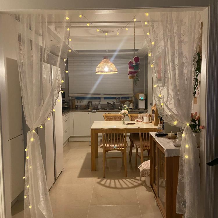 miqu****님의 화이트&우드 조합의 주방입니다! 커튼에 전구를 달아 분위기를 업시켜주셨네요!