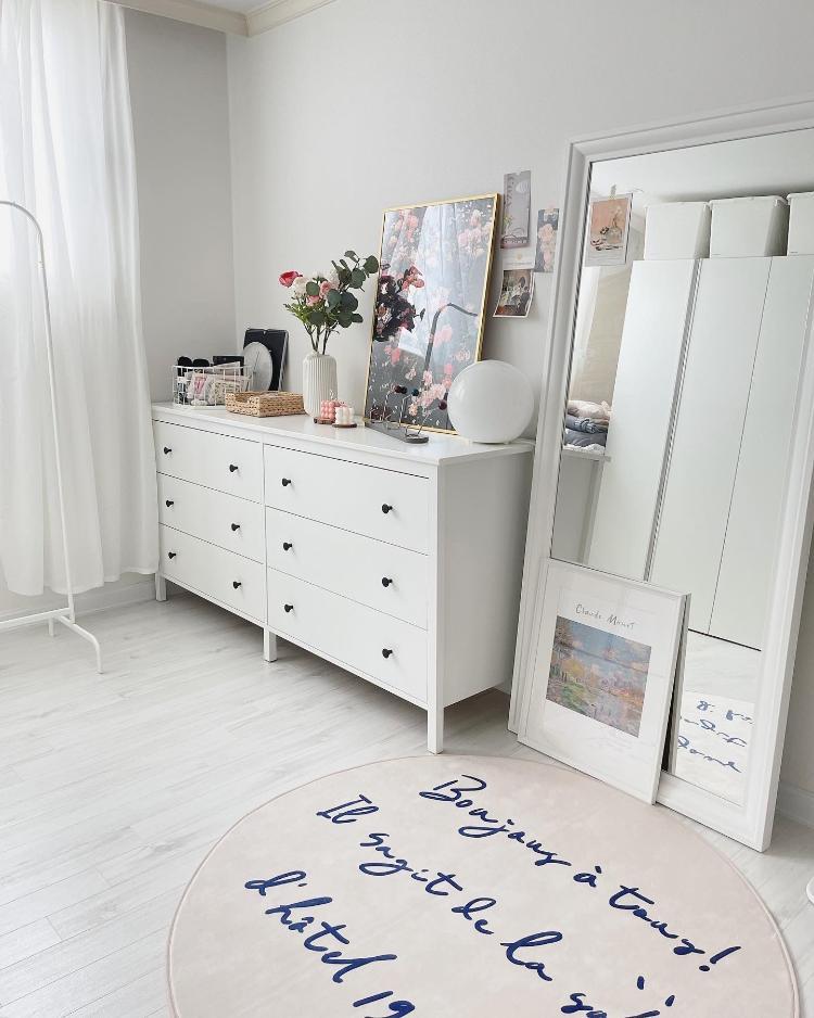 pigr****님의 새하얀 드레스룸입니다. 화이트 가구와 함께 서랍장위에는 예쁜 소품들로 꾸며주셨어요. 화이트 러그 까지 너무 완벽한 드레스룸이예요:)