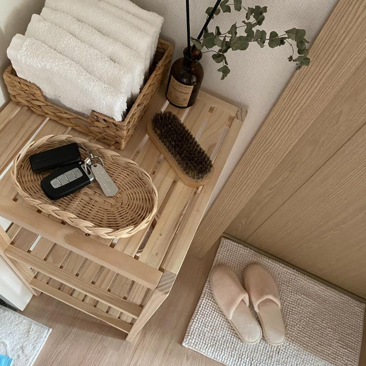 포근한 러그를 깔아두고, 선반에는 방향제와 자주 사용하는 차키, 지갑, 마스크 등을 가볍게 둘 수 있도록 바구니를 두었어요.