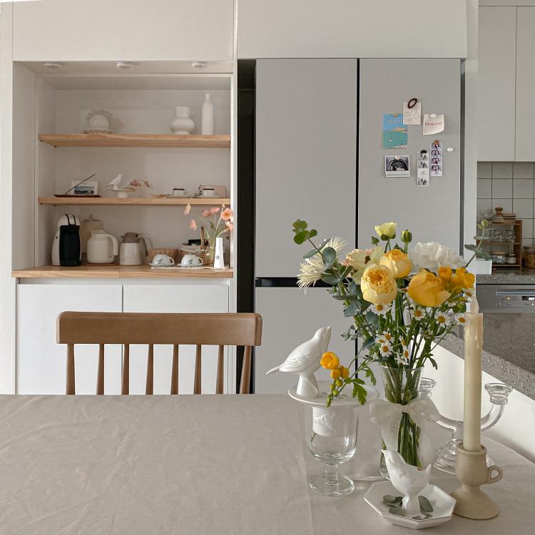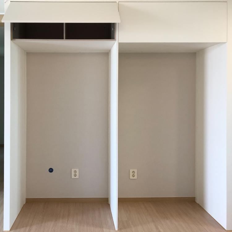 또, 입주하실때 많이 고민하시는 부분 중 하나가 냉장고장인데요,저희는 김치냉장고가 아직 필요치 않은 터라 이렇게 빈 공간을 어떻게 할지 고민이 많았어요. 대부분 문짝을 달아서 다용도장으로 사용하시던데, 저만의 카페 공간으로 만들고 싶었거든요. 결국 김치냉장고장에 딱 맞는 카페장을 직접 고안해 주문제작을 요청했답니다!