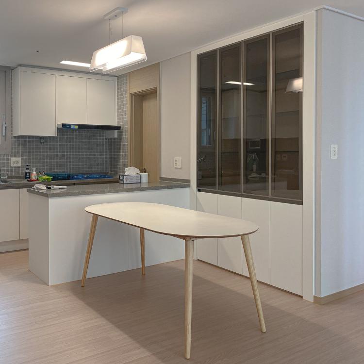 그리고 제일 문제였던 흑경은 신랑의 도움을 받아 교체해주었어요. 직접 실측 후 문짝만 따로 주문하면, 저렴한 비용으로 간단하게 교체가 가능하답니다! 생각보다 어렵지 않았어요! 그리고 조명 또한 제가 좋아하는 펜던트등으로 바꾸어 주니, 제가 원하던 분위기의 주방이 탄생했어요!