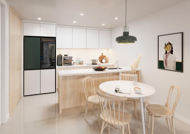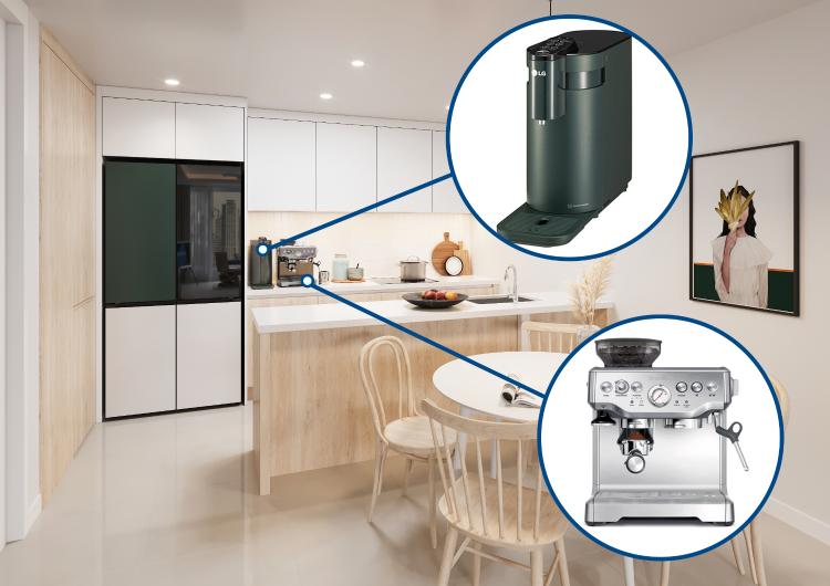 이번 공간에 배치한 비스포크는 내 취향을 반영하여 색을 바꾸며 조합 할 수 있는 냉장고로 큰 인기를 끌고 있죠, 그 옆에 배치된 오브제컬렉션 정수기 또한 카밍그린로 멋스러운 색을 더해줬습니다.마지막으로 반자동 커피 머신으로 홈카페를 완성시켰습니다. 그린으로 포인트 준 주방에서 원목 카페 분위기를 살리며 홈카페를 즐겨보는 건 어떨까요?