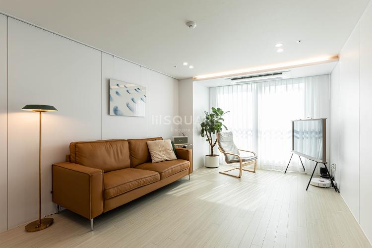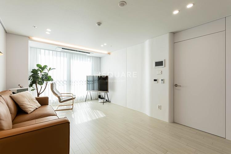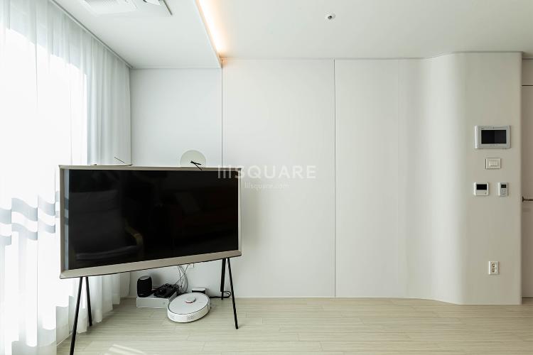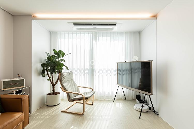 세 가족의 단란한 일상이 펼쳐질 거실입니다. 목공 공사와 화이트 필름 벽지 시공으로 전체적으로 깔끔하고 모던한 분위기를 만들었습니다. 시스템 에어컨은 공간을 확보할 수 있는 히든키인데요! 부피감 있는 TV장 대신, 스탠드형 TV의 틈새 배치 또한 21평형 거실의 넓은 공간감에 한 몫하는 것 같습니다.