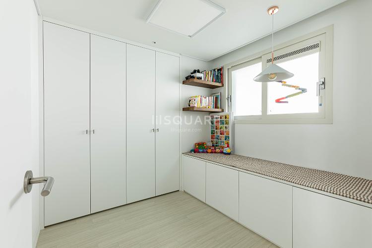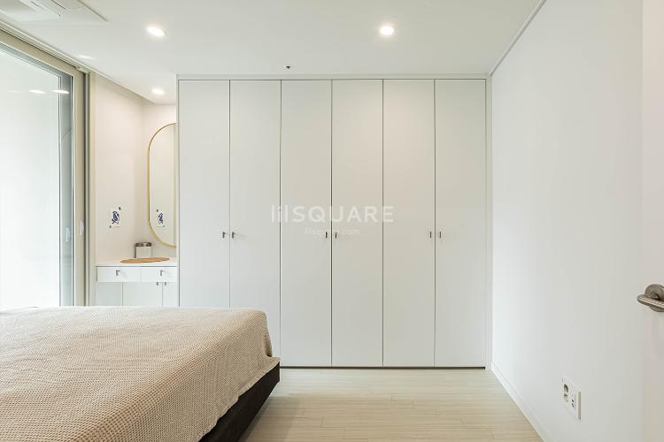 침실방은 충분히 수납하실 수 있도록, 붙박이장 설치해드렸어요. 왼쪽 공간 살짝 확보해 화장대도 마련하였습니다.