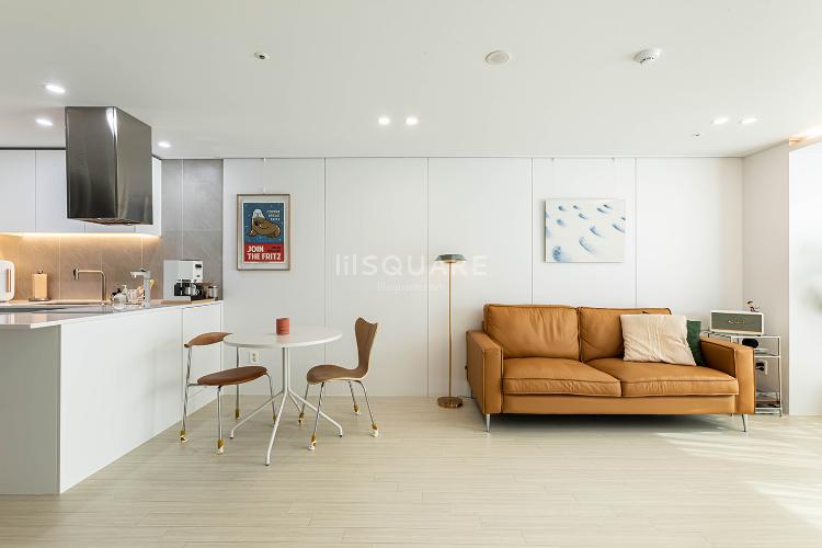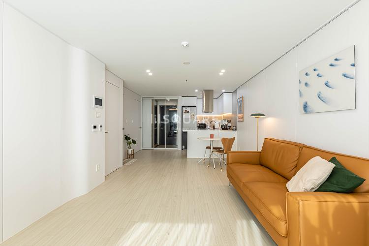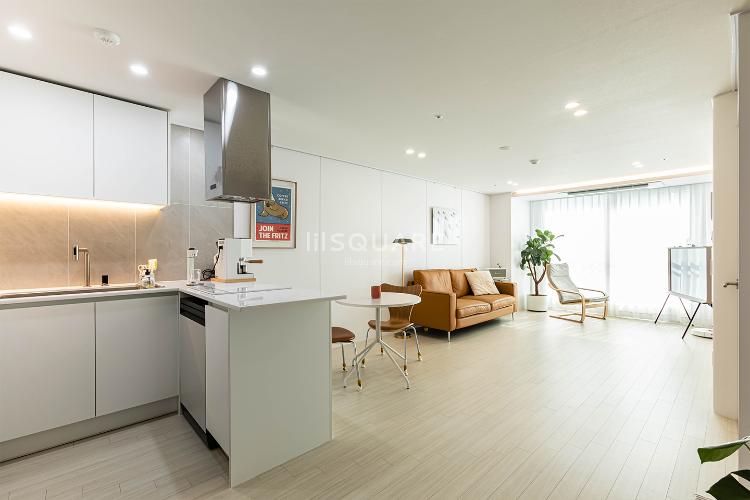 거실 벽면 목공 마감과 자연스럽게 이루어지는 주방 라인, 아주 좋습니다.