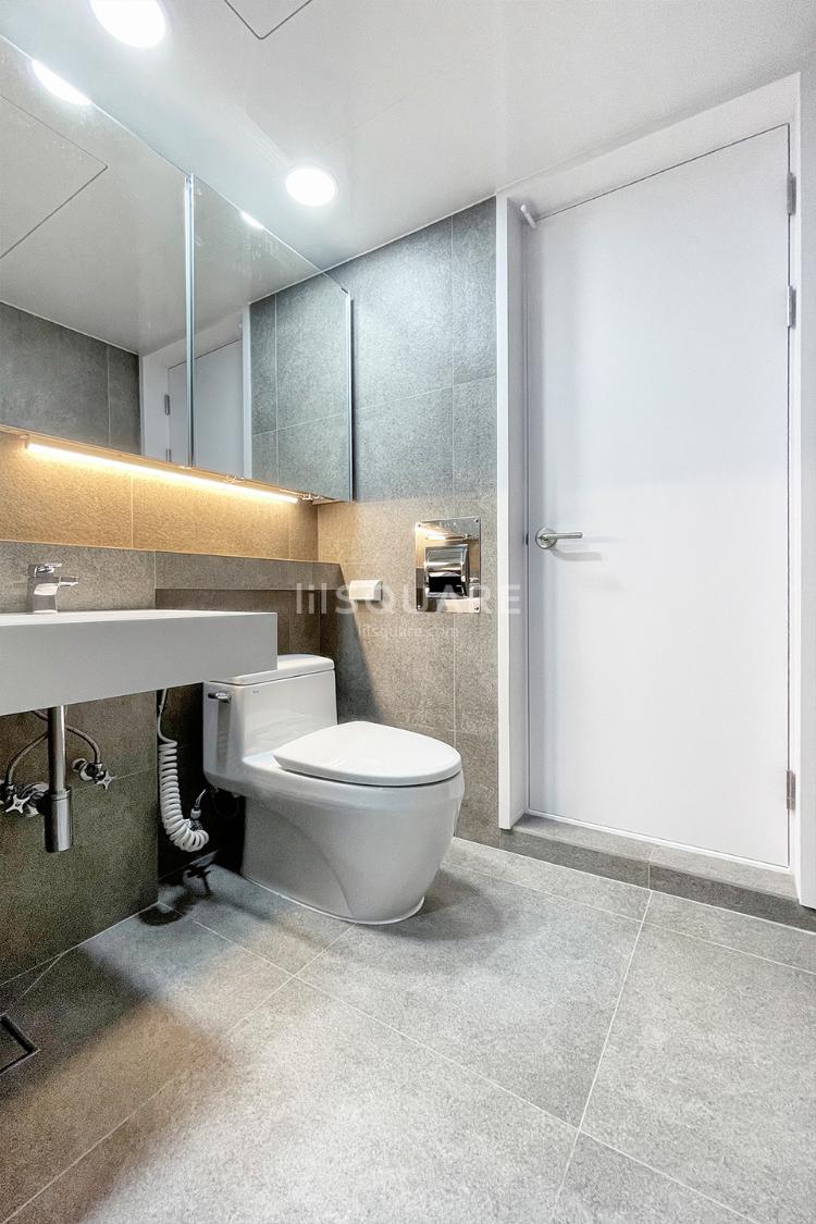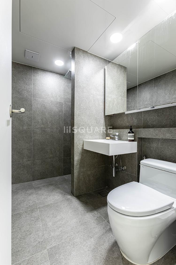 포세린 타일 욕실입니다. 젠다이는 길이를 연장하고, 상판을 포세린 타일로 마감해드렸어요. 고객님의 라이프스타일에 맞게 욕조를 철거하고, 조적 파티션 추가 설치해 샤워공간을 확보했습니다.