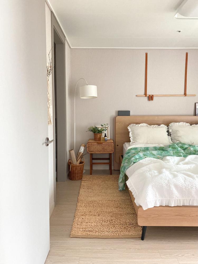 홈오피스 공간을 만들고 계신 일사공일부부님의 침실도 한 번 보실까요? 라탄과 우드로 여름여름한 느낌을 주셨는데요. 화이트와 라탄,우드를 섞어 분위기를 연출하시고 그린으로 포인트 컬러까지 연출해주셨답니다!