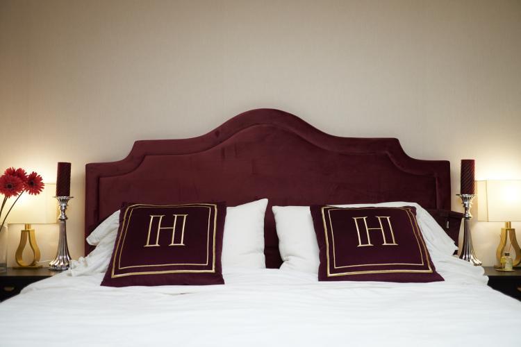 침대 헤드보드의 모양은 클래식하지만 벨벳 재질의 버건디 컬러로 커스텀 제작하여 유니크함을 더해주고, 같은 계열의 이니셜 쿠션을 두어 세련됨까지 같이 잡으셨답니다. 양 옆에 같은 종류 스탠드와 촛대 등이 통일감도 주네요:)
