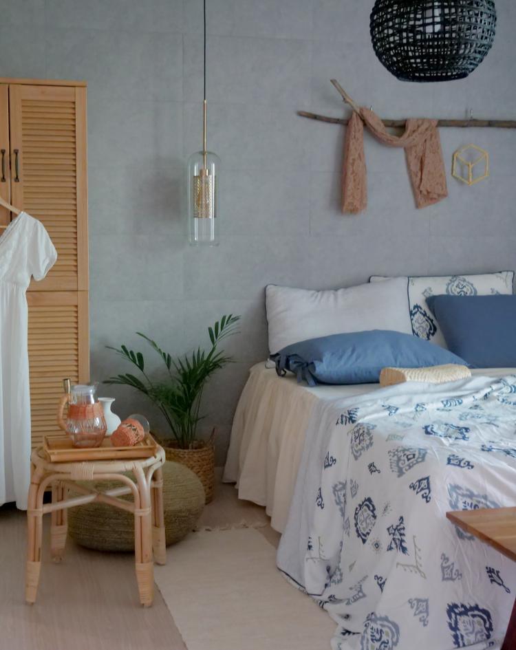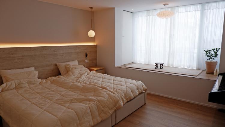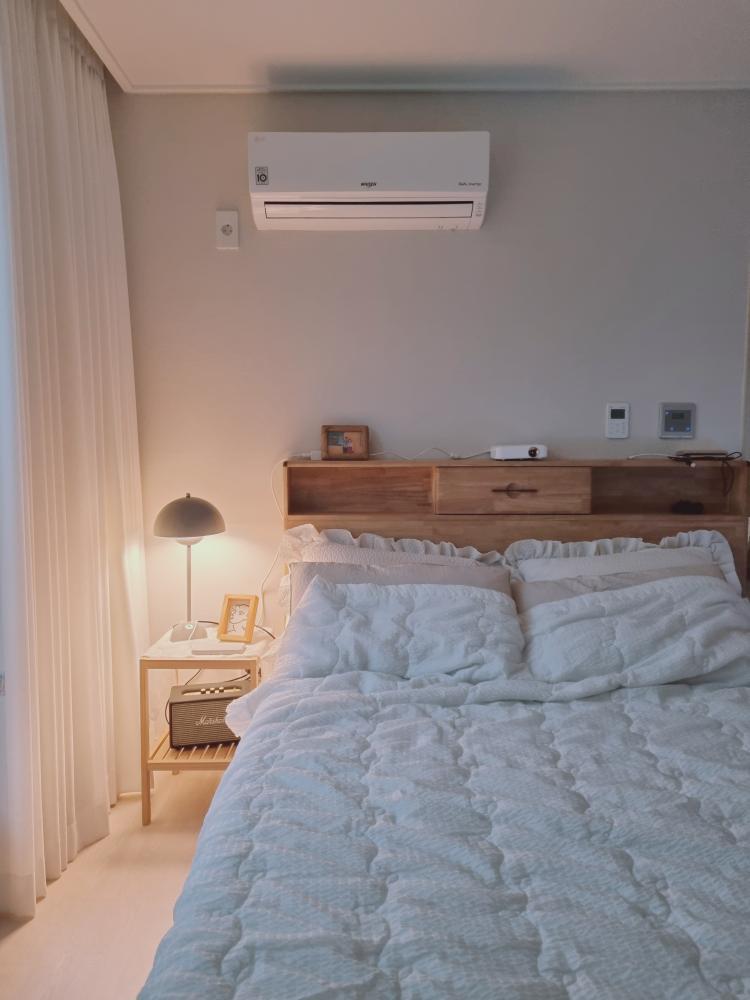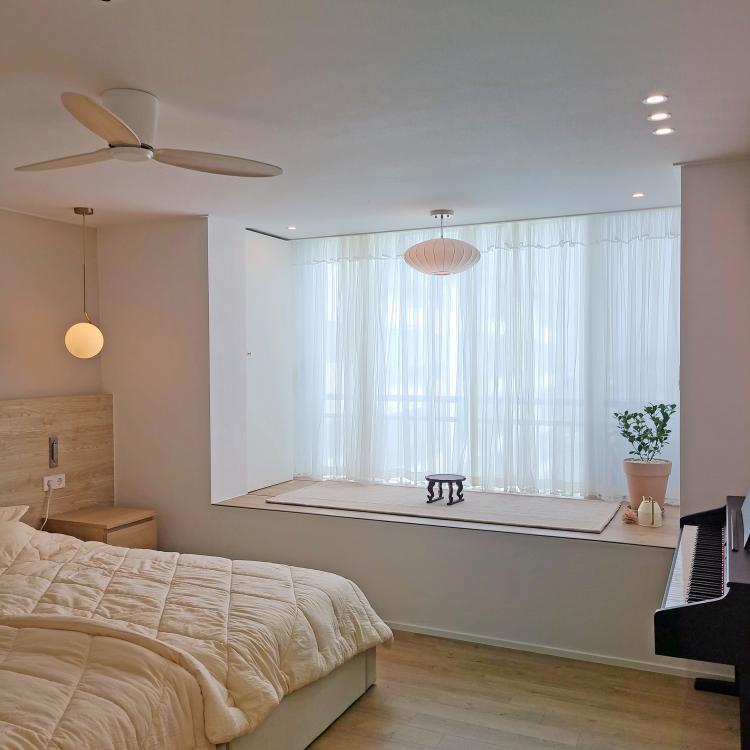 취향을 반영하여 꾸민 집에서 홈캉스를 즐기며 살고 있는 오월다섯시 고객님의 침실입니다. 휴양지 감성의 휴식공간으로 침실을 꾸미셨는데요. 숙면의 목적 때문에 많은 가구를 두지 않고 편안하게 쉴 수 있도록 인테리어 하셨어요.