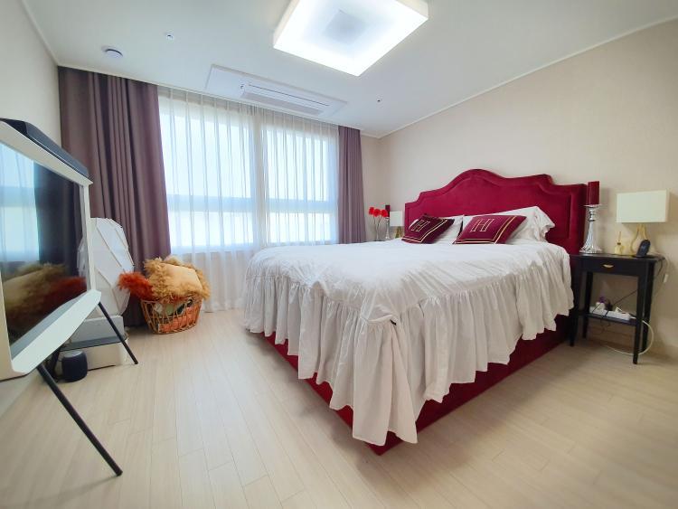 버건디 무드의 로맨틱한 침실을 꾸미신 어니 고객님의 침실 인테리어입니다. 신혼인 만큼 과감한 컬러를 사용해 로맨틱한 무드를 연출하고자 하셨답니다:) 침실도 침대 딱 하나만 두었다고 하시는데요 대신 킹사이즈의 거대한 크기로 장만하셨답니다!