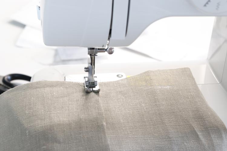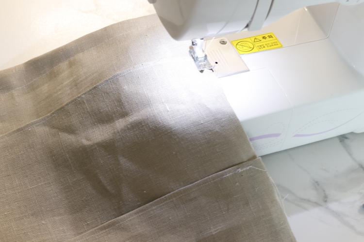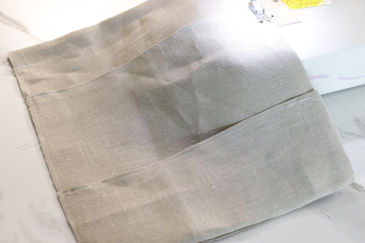 5. 아래로 내린 1번천의 10cm는 위로 접은 후 1번천과 2번천 세로 양 끝을 함께 박음질 해 주세요.(상단 1cm제외)