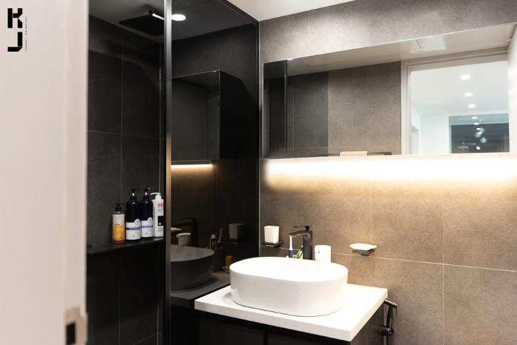 욕실을 들어가 볼까요? 세면기와 변기가 위치해있는 곳과 샤워부쪽을 구분감을 주기 위해 톤을 달리 했어요. 좀 더 진한 그레이와 좀 더 연한 그레이로 투톤! 블랙수전과 블랙 하부장 세면대 각각의 아이템들. 시크함이 두배로~!
