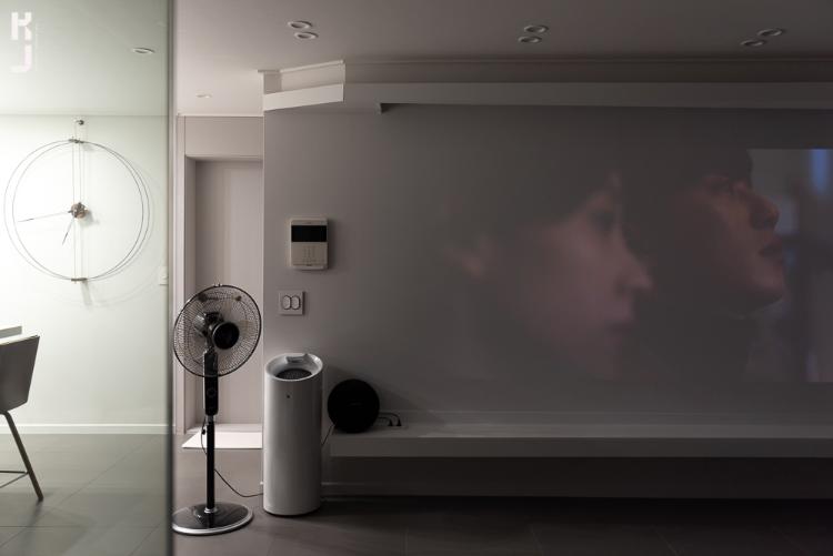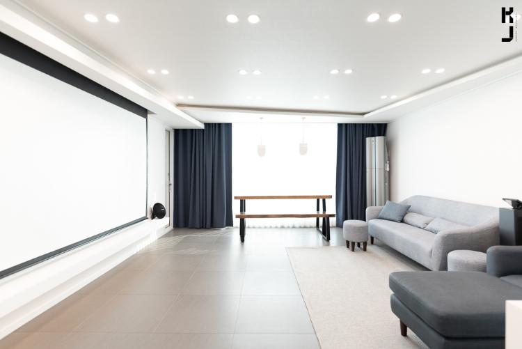 거실 사진 한 장만 봐도 넘나 두근두근! 모던하면서도 깔끔한 분위기가 무척 멋스러워요. TV는 없애고 빔 프로젝터를 설치했어요.