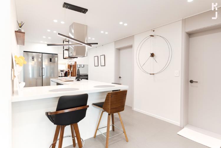 부엌이에요. 원래는 30평대 가장 흔한 'ㄱ'자 주방이였는데 기존 구조를 완전 탈피하여 대면형 주방을 추천드렸어요! 기존 배수구가 있던 자리에 냉장고와 키큰장을 배치하고, 개수대와 쿡탑을 아일랜드 쪽으로 옮겨 인테리어 효과를 +100!