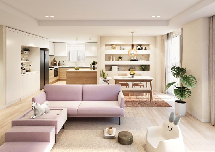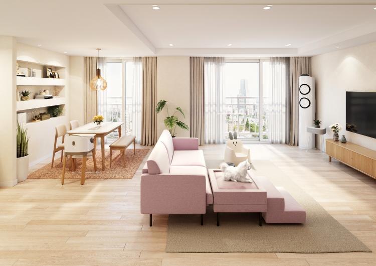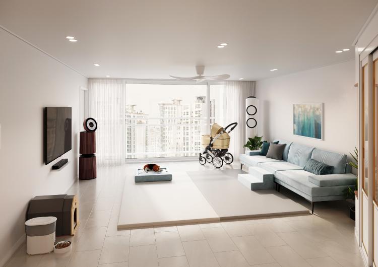 반려견과 어린 아이가 함께 생활하는 자녀가구 라이프스타일 속 펫테리어입니다. 거실 소파는 마찬가지로 반려견을 위해 계단과 방석이 있는 제품으로 선택했네요. 파스텔의 톤온톤 컬러 인테리어로 전체적으로 안락하면서도 따뜻한 느낌을 더한 인테리어를 연출했습니다.